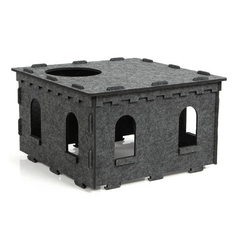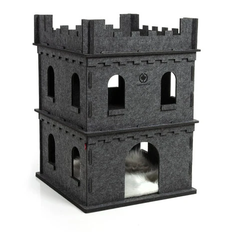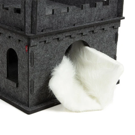 Het katten kasteel bestaat geheel uit vormvast vilt en is met steekverbindingen eenvoudig in elkaar te zetten. De benedenverdieping biedt een comfortabele toegang tot het vilten kasteel en een snelle retraite. Een knuffelig omkeerbaar kussen met pluche vacht zorgt voor absoluut comfort in het kasteel.