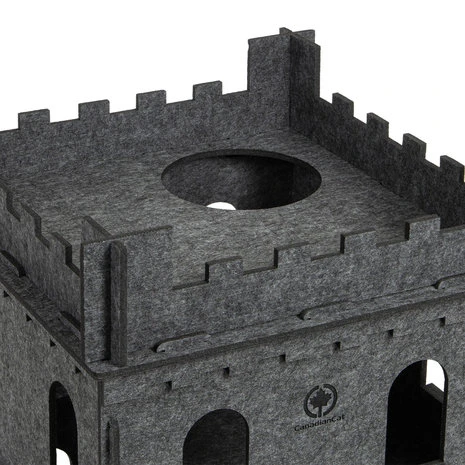 Het dak, dat is omzoomd met vilten kantelen, biedt de kat het beste uitkijkpunt, van waaruit hij je hele koninkrijk op de optimale hoogte in de gaten kan houden en nieuwkomers vroeg kan spotten. Een natuurlijke lichtinval in het interieur van het kasteel wordt gegarandeerd door de grote raampartijen op alle verdiepingen. De ramen zijn groot genoeg om b.v. B. om naar een kattenspeelgoed te grijpen of ander speelgoed te vangen.