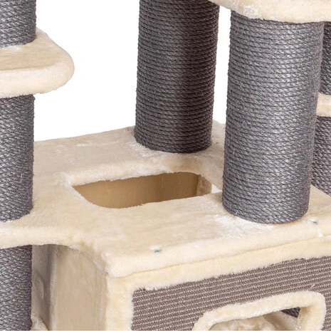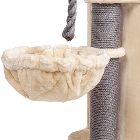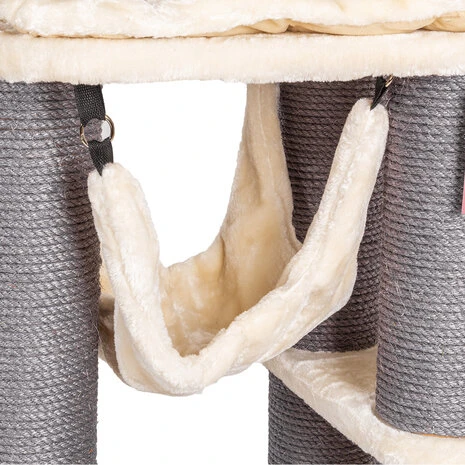 De Hudson krabpaal is ideaal voor een huishouden met meerdere katten en heeft veel niveaus om te spelen, liggen en dommelen. De robuuste palen omwikkeld met sisal bieden voldoende mogelijkheden voor de nodige klauwverzorging en beschermen ook je behang, tapijten, gordijnen en meubels tegen de wilde krabaanvallen van je lieveling. De 2 grote hangmatten zijn gemaakt van extra dik pluche en voorzien van een stalen beugel waardoor deze ook de zwaardere of grote katten kan dragen.