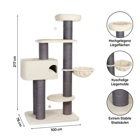 Deze krabpaalserie is ideaal voor een huishouden met meerdere katten door de vele verschillende en gevarieerde lig- en krabmogelijkheden! De zware bodemplaat en de vele onderling verbonden niveaus geven de krabpaal een hoge mate van stabiliteit. Dit maakt het bijzonder geschikt voor bijzonder grote en zware kattenrassen.