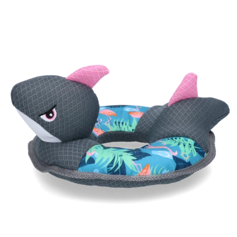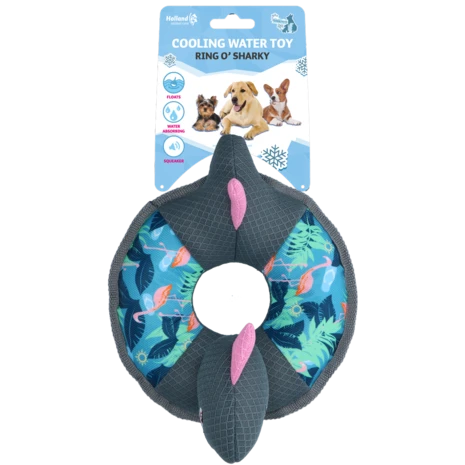 De gave Ring O’Sharky is het ideale speeltje voor je hond in de zomer! Niet alleen blijft de eend drijven op het water en kan het dus bij het apporteren gebruikt worden; ook neemt het water op. Zodra je hond de eend in de bek neemt, komt er water vrij wat opgedronken kan worden. Zo helpt het op speelse wijze om uitdroging te voorkomen. Het speelplezier wordt bovendien extra vergroot door het kraakmateriaal en het piepje dat in het speeltje verwerkt is.