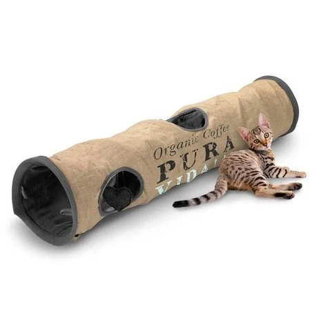 Speeltunnel voor de kat gemaakt van sterk jute aan de buitenkant, heerlijk zacht fleece stof aan de binnenkant. De tunnel wordt verstevigd met stalen ringen die om de 30 cm in de tunnel zitten verwerkt. Wanneer je kat even niet speelt met deze tunnel kan je de speeltunnel gemakkelijk inelkaar vouwen en opbergen. De gebruikte materialen kunnen het geweld aan van uw kat, geen zorgen dit product zal uw kat lang en veel plezier aan beleven.Â