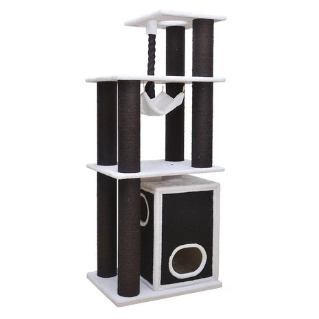 De EBI krabpaal Swindon is een pluche krabpaal van 190 cm hoog dat staat als een huis. Zijn brede opstelling, bestaande uit brede krabstammen van maar liefst 15 cm dik, maakt het geheel super stabiel. De krabpaal heeft alles wat een kattenhart begeert: een stevige ondergrond, brede sisal palen, een comfortabel schuilhuisje bestaande uit 2 verdiepen, een hoge hangmat, een hoge ligmand en een extra dik speeltouw. Deze krabpaal is geschikt voor grote en actieve katten of gezinnen met meerdere katten.