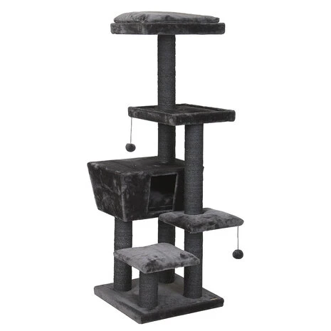 Krabpaal Trend North Dakota is een moderne middelgrote krabpaal, uitgerust met verschillende lig- en zitplaatsen en tevens een rust-/slaap huisje. Zeer degelijk en slijtvast door de geheel verlijmde sisal en pluche. In het huisje en op de bovenste ligplank is een zacht kussen voorzien. (wasbaar op 30° C) Daarnaast is er onder 2 ligplaatsen een speelballetje met elastiek gemonteerd zodat de kat naar hartenlust kan spelen.