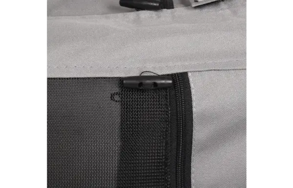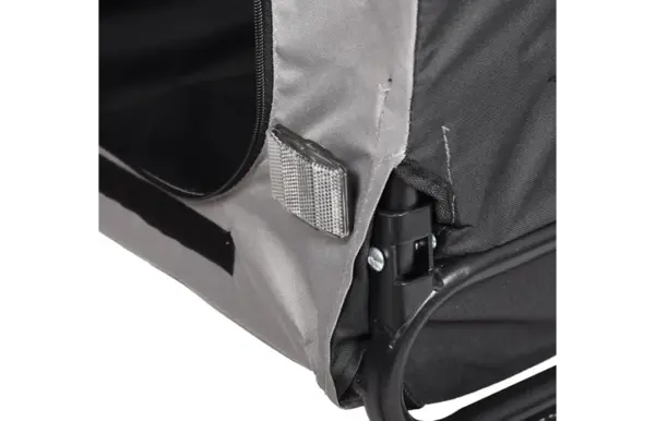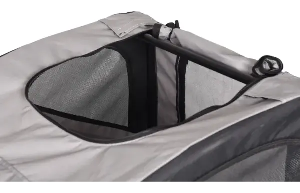Makkelijk opvouwbaar, inclusief afneembare regenhoes. Binnen in de fietskar zitten 2 korthouders om de hond(en) vast te maken.