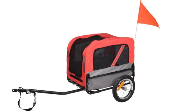 Makkelijk opvouwbaar, inclusief afneembare regenhoes. Binnen in de fietskar zit een korthouder om de hond vast te maken.
