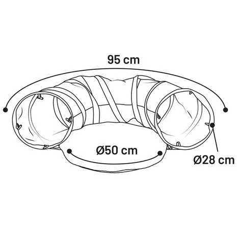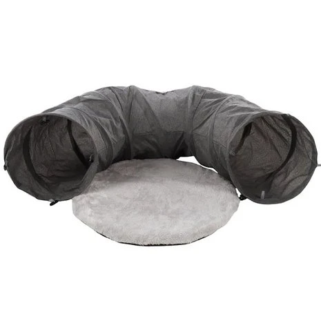 Polyester speeltunnel met ijzeren ringen. Met pluche kussen, gevuld met polyestervlies en met antislip bodem. De afneembare hoes kan met de hand gewassen worden.
