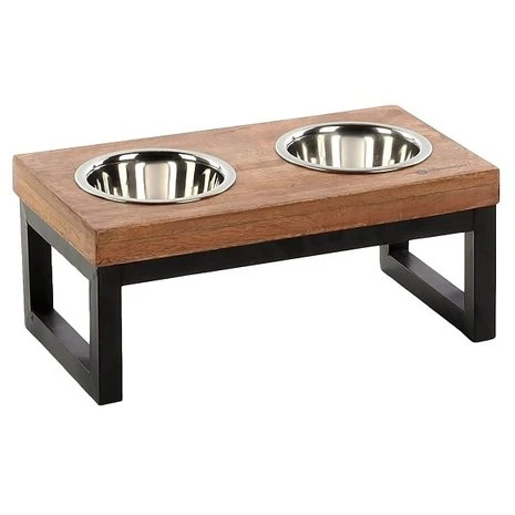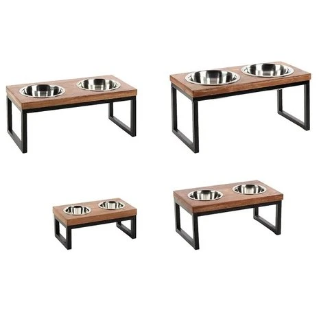 Luxe voer en waterbak gemaakt van Mangohout met zwarte metalen frame. 2 uitneembare inox eet en drinkschalen welke in de vaatwasser kunnen (De staander niet) Met bescherming aan de onderzijde om de vloer krasvrij te houden.