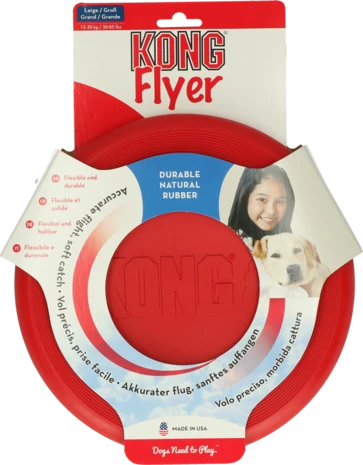 De perfecte frisbee voor honden. Gemaakt van het oersterke rubber van KONG. Deze flexibele frisbee is makkelijk te vangen door honden zonder dat er schade kan optreden aan het gebit. Omdat het product buigzaam is, kunt u het makkelijk meenemen tijdens een wandeling. Ondersteunt een gezonde lichaamsbeweging en stimuleert het jachtinstinct van uw hond.