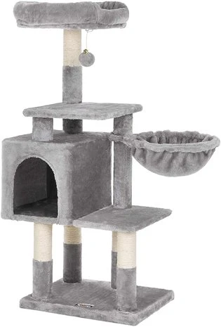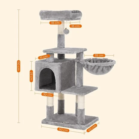 Kleine krabpaal met voldoende slaap en rustplaatsen, zoals een schuilgrot een grote ligplek boven en een stevige hangmat met metalen frame aan de zijkant. Dankzij de extra opstapjes is deze krabpaal ook geschikt voor de wat oudere katten.