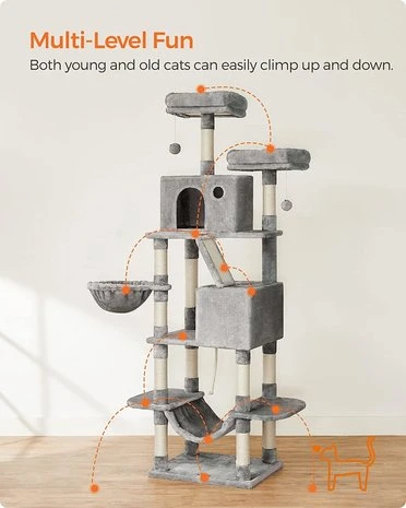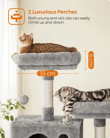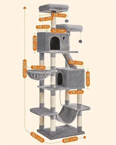 Krabpaal Tarrenz heeft een hoogte van maar liefst 206 cm! Ondanks dat deze krabpaal zo hoog is, is deze zo gemaakt dat deze ook geschikt is voor oudere katten en zelfs kittens. De opstap en lig plateaus zijn zo geplaatst dat het makkelijker is om omhoog te klimmen.