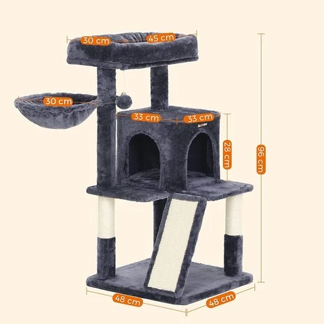 Een kleinere krabpaal van 96 cm hoog. Zeer geschikt voor jonge en volwassen katten maar ook zeker voor de wat oudere kat. 3 comfortabele ligplaatsen. Een plekje om in te schuilen of zal je kat liever op de bovenste ligmand liggen om alles daar in de gaten te houden. Welke plek je kat ook kiest de krabpaal zal zeker in de smaak vallen.