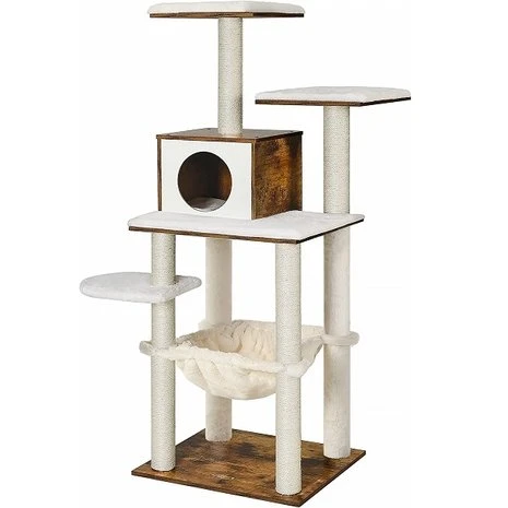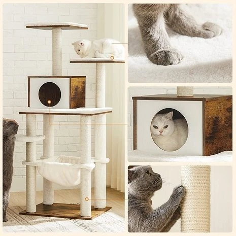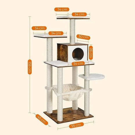 Een exclusieve krabpaal gemaakt van hout. Hoge kwaliteit en perfect afgewerkt. De krabpaal heeft diversen ligplaatsen voorzien van zachte ligmatjes, de matjes mogen gewassen worden in de wasmachine. Met een heerlijke hangmat welke extreem stevig is dankzij de bevestiging aan 4 sisalpalen.