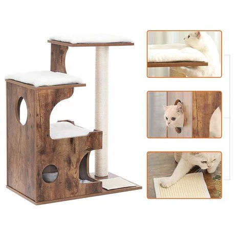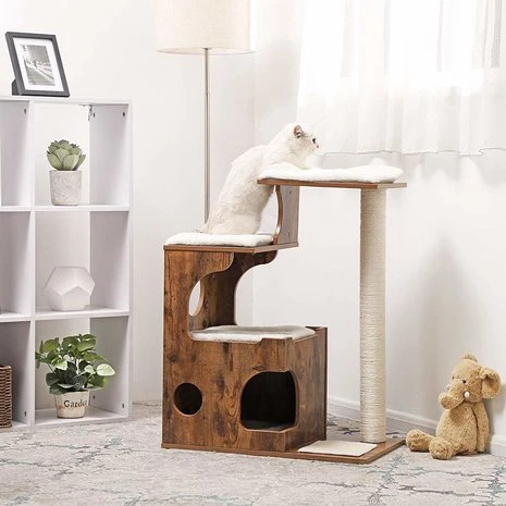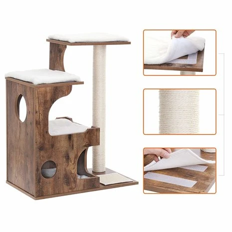 Een exclusieve krabpaal gemaakt van hout. Hoge kwaliteit en perfect afgewerkt. De krabpaal heeft diversen ligplaatsen voorzien van zachte ligmatjes, de matjes mogen gewassen worden in de wasmachine. Aan de zijkant is een extra lange sisalpaal geplaatst van 80 cm hoog. Hier kan je kat zich uitrekken en zijn nagels scherpen.Â