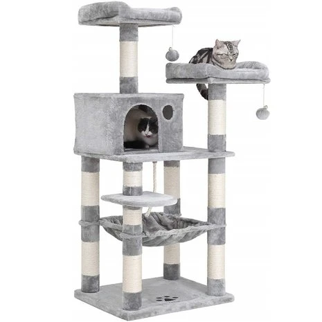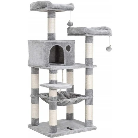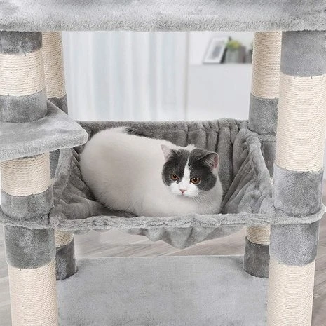 Een stevige krabpaal met ruime keuze aan ligplaatsen, daarmee ook geschikt voor meerdere katten. De krabpaal heeft een gewicht van 14 KG daarmee mogen we gerust zeggen dat deze krabpaal stevig is en van goede kwaliteit, er is gebruik gemaakt van 540 gram dik pluche. Deze dikte van pluche verlengt de levensduur van de krabpaal.Â