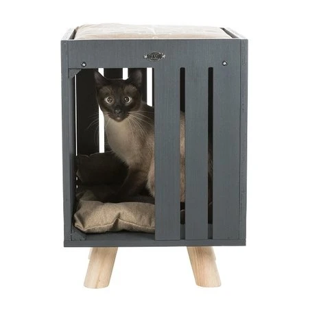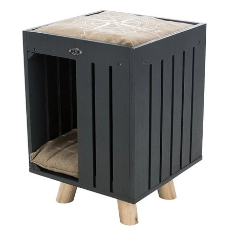 Kattenhuis gemaakt van triplex, gelakt. Wendbaar kussen voelt aan als canvas en vulling van polyestervlies. Met houten pootjes en een draaggewicht van max 40 KG.Â