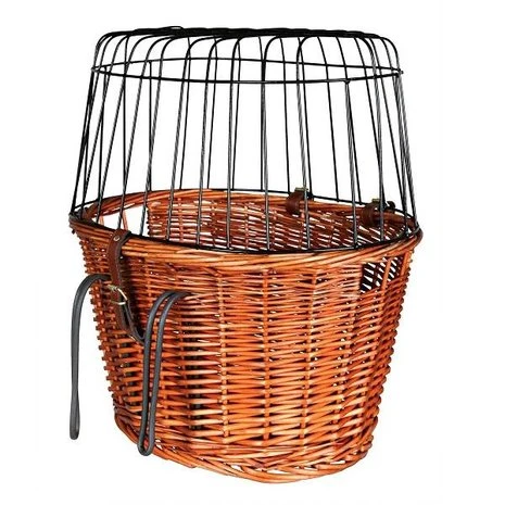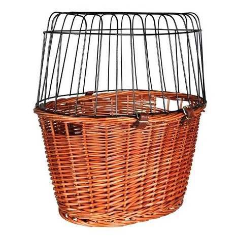 Fietsmand voor het vervoeren van je kleine hond, gemaakt van wilgentakken met draadkoepel om te voorkomen dat je hondje eruit kan springen. Deze fietsmand dient aan het stuur te worden gehangen.