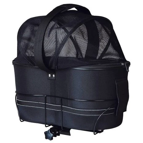 Fietstas gemaakt van vormvast EVA. Stevig metalen frame voor een veilig vervoer van je hond op de bagagedrager. Tas m.b.v. klittenband van frame los te maken en als vervoerstas te gebruiken. Gaas-afdekking biedt optimale bescherming, vooral bij energieke dieren, en zorgt voor een goede luchtcirculatie. Geïntegreerde korthouder voorkomt dat je hond eruit kan springen. Tas met reflecterende strepen en uitneembaar, gevoerde pluche bodem.Â