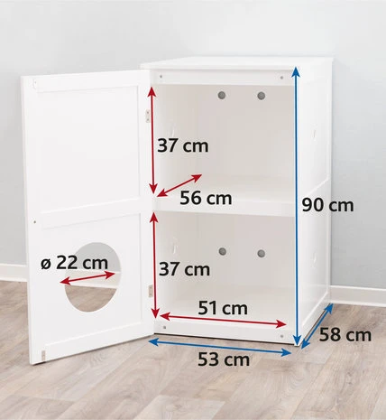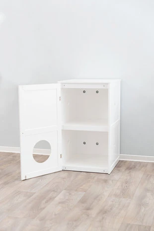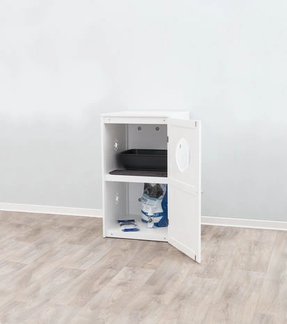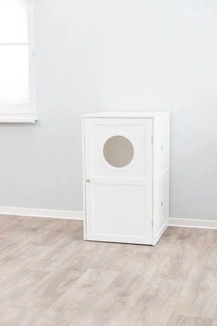 Kattenmeubel geschikt om kattenbak in op te bergen maar kan ook als decoratief slaaphuis worden gebruikt. Gemaakt van MDF wit gelakt. De ingangsopening kan naar keuze naar boven of naar onderen gericht worden. Met schoonloopmat voor kattenbak, een kattenbak wordt niet meegeleverd. Maximale afmeting voor kattenbak: 56 x 51 cm