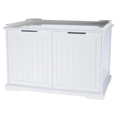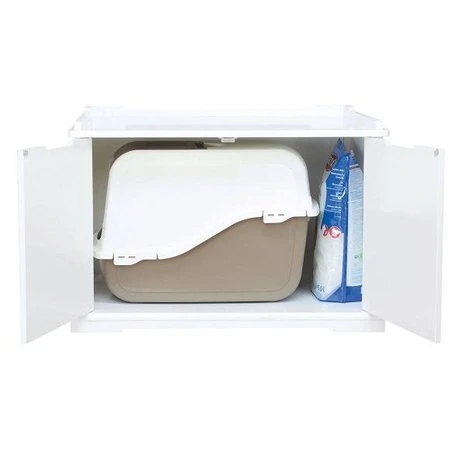 Kattenmeubel geschikt om kattenbak in op te bergen maar kan ook als decoratief slaaphuis worden gebruikt. Gemaakt van MDF wit gelakt. De ingang aan de zijkant kan zowel links als rechts worden gemonteerd. Voorkant is voorzien van grote deur die makkelijk gesloten blijft door de magneet sluitingen. Het bovenbla…