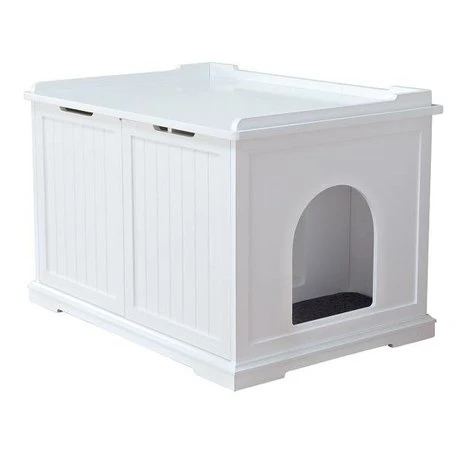 Kattenmeubel geschikt om kattenbak in op te bergen maar kan ook als decoratief slaaphuis worden gebruikt. Gemaakt van MDF wit gelakt. De ingang aan de zijkant kan zowel links als rechts worden gemonteerd. Voorkant is voorzien van grote deur die makkelijk gesloten blijft door de magneet sluitingen. Het bovenblad heeft een draaggewicht van maximaal 90 KG. Het wordt afgeraden om erop te zitten. Een kussentje om een extra lig plaats te creëren voor je kat of hond behoort tot de mogelijkheden.