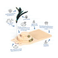 Krabkarton met hout look. Om neer te leggen inclusief catnip. 2 balletjes binnenin zetten tot spelen aan.
