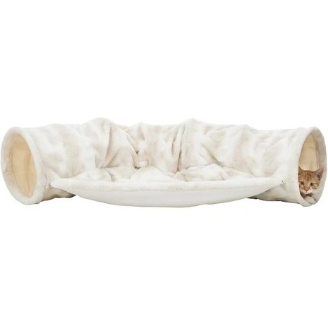 Pluche speeltunnel voor katten met ligmand. Gemaakt van extra zacht pluche (polyester) Afneembaar kussen met slipvaste rubberen onderkant.Â