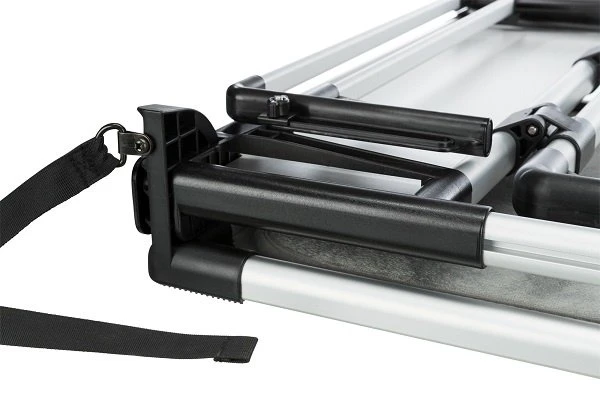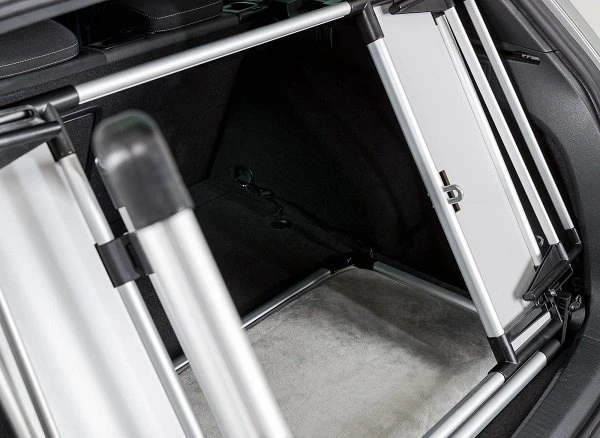 Om de laaddrempel te overwinnen kan de deur op 2 hoogtes worden gemonteerd. Met slipvaste ligmat, wasmachine tot 30 °C. Bodemplaat met klittenbandpootjes inclusief 4 bevestigingshaken. Gemaakt van aluminium/kunststof.